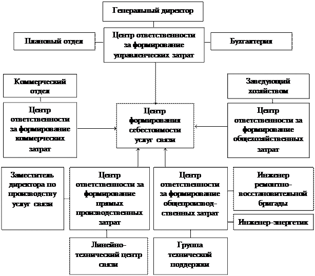 3) к прямым затратам относятся затраты по осуществлению услуг связи: материалы, заработная плата основных производственных рабочих. Непосредственным производством услуг связи в организации занимается линейно-технический центр связи, а руководит им – заместитель директора по производству услуг связи. Поэтому при этом отделе сформирован центр ответственности за формирование прямых производственных затрат (ЦФО ПЗ). Ответственным за формирование прямых затрат является заместитель директора по производству услуг связи;