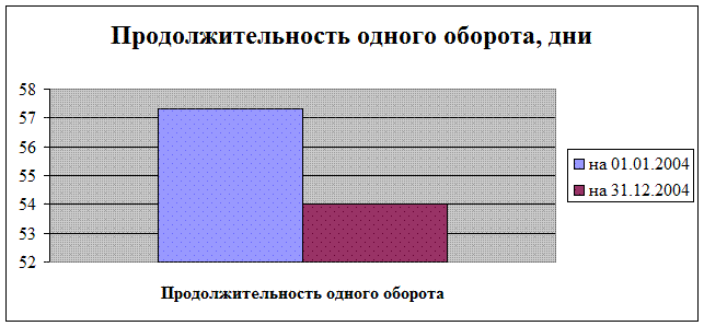 Так продолжительность одного оборота оборотных активов в ООО «Крузарус» составляет 54 дня, что очень много даже по меркам России. Необходимо также учесть, что данный показатель хоть и высокий, но имеется тенденция к его уменьшению в 2004 году.