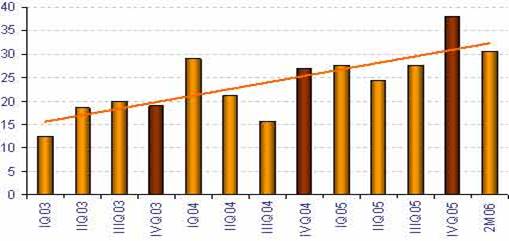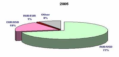 В четвертом квартале 2005 года оборот рынка на 40% превысил показатель четвертого квартала 2004 года. На увеличение оборота рынка оказал влияние приток валютных средств в Россию по каналам экспортной выручки и внешних заимствований финансовых институтов и крупных компаний. Сальдо текущих операций (товары и услуги) за первые 9 месяцев 2005 года составило $78 млрд., чистые ссуды и займы составили около $8 млрд. Большая часть валютных средств была сосредоточена в государственном валютном резерве. По официальным данным он за этот период вырос на $40.5 млрд. Фактически объем покупок Банком России валютных средств за рубли был еще больше, т.к. часть средств валютного резерва была направлена на платежи по внешним обязательствам РФ.*