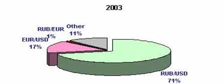 На рис. 2 приведена валютная структура российского валютного рынка, рассчитанная за 2003 и 2005 годы. Доля операций с долларом США за два года увеличилась всего на 1%. В 2006 году также не произошло резких изменений и выхода операций по другим валютам на более высокие уровни.*