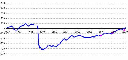 На рис. 5 показан ряд динамики индекса реального эффективного курса рубля, восстановленный по сопоставимой методике с базой 1995 года. Видно, что текущее значение индекса аналогично началу 1997 года. В экономической практике реальный эффективный курс принято рассматривать как показатель конкурентоспособности экономики по отношению к внешним рынкам. Значит можно говорить о том, что к началу 2006 года полностью отыграны все предполагаемые преимущества, полученные российской экономикой при резкой девальвации национальной валюты при кризисе 1998 года. Дальнейшая конкурентоспособность российских товаров, как на внешних, так и на внутренних рынках (через рост спроса на импорт) будет определяться их потребительскими качествами.*