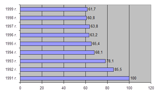Трансформационный кризис 1990-х качественно изменил наше место в мире отбросив российскую экономику далеко назад (см. табл. 1) Вклад России в мировой ВВП сократился с 3,4% в 1991 г. до 1% в 2001 г. а по паритету покупательной способности - с 5,3 до 2,6% Уровень душевого дохода в России в 2001 г составил около 5,8% от уровня в США (2135 долл. на человека по текущему курсу) и она занята 78-е место среди 175 стран по выборке МВФ пропустив вперед такие страны как Бразилия (2986 долл.) и Польша (4562 долл.)[4]