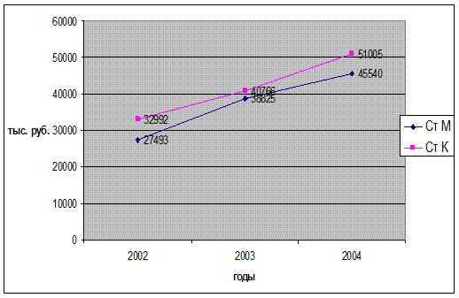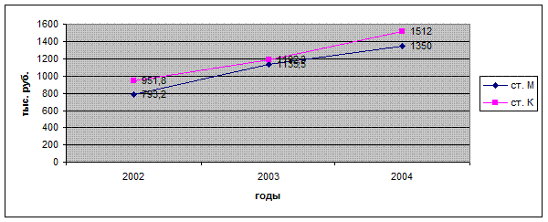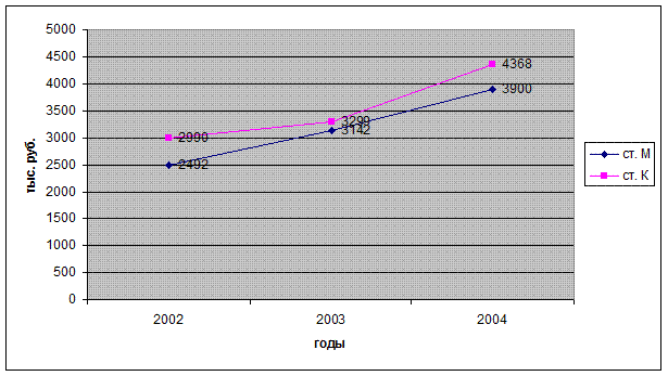 Как видно из рисунка по ст. К прочие расходы выше чем по ст М, что связано с превышением объемов услуг по ст К. В 2002 году превышение составило – 518 тыс. руб., в 2003 году – 218 тыс. руб., в 2004 году – 547 тыс. руб.