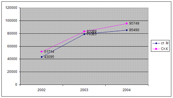 Таким образом, исходя из проведенного анализа можно сделать вывод, что объем оказываемых услуг по ст К намного выше, чем по ст М, что , в свою очередь, влечет за собой рост и превышение всех статей расходов. Кратко охарактеризуем основные тенденции развития в 2002 – 2004 годах по ст М и ст К.