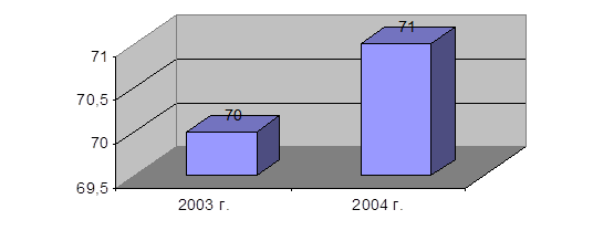 Итак, среднесписочная численность в 2003 г. составляла 70 чел., а в 2004 г. – 71 чел.