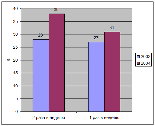 Необходимо отметить, что за годовой период уменьшилось количество потребителей молочных десертов. С чем это может быть связано? Уменьшение доли потребителей часто бывает показателем сконцентрированной работы производителя со своей целевой группой покупателей: иными словами происходит более точное позиционирование продукта. Процесс уменьшения количества покупателей в этом случае должен сопровождаться увеличение частоты или объемов потребления. Именно это наблюдается на рынке молочных десертов. На рис. 2. представлена частота потребления данного продукта в 2004 и 2004 годах в г. Новосибирске.