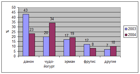 Увеличение доли покупателей и частоты потребления продукта повлекло изменения в приоритетах покупателей относительно производителей, представленных на рынке. Лидер прошлого года – компания Данон сдала позиции на сегменте густых йогуртов. По приверженности покупателей в этой группе продуктов на первое место вышла марка «Чудо – йогурт» компании «Вимм – Билль- Данн»[2, с.99].