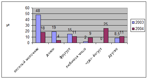 Суммарно число приверженцев продукции снизилось с 48 % до 41 %, но эти 41 % перераспределились между «веселым молочником» (число приверженцев – 16 %) и «Чудо- йогуртом (25%), в а 2004 году все 48 % принадлежали марке «Веселый молочник».