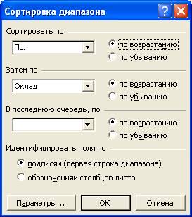В открывшемся окне Сортировка диапазона в разделе Сортировать по выберем поле Пол, для которого зададим сортировку по возрастанию, а в разделе Затем по выберем поле Оклад, для которого зададим сортировку по возрастанию.