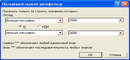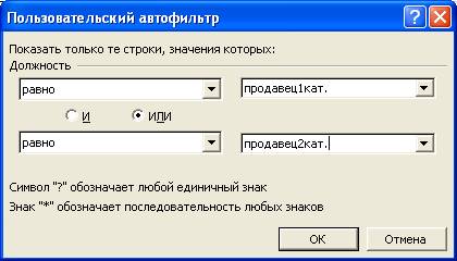 Для поля Должность из меню автофильтра выберем пункт Условие. После чего, в открывшемся окне Пользовательский автофильтр зададим равно продавец1кат ИЛИ продавец2кат.