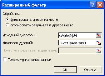 В открывшемся окне зададим фильтровать список на месте, для Исходного диапазона: A6:I84, а для Диапазона условий – A1:I3.