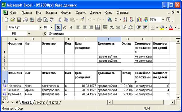 Используя операцию расширенного фильтра, выполнить одношаговую фильтрацию, согласно приведенным критериям фильтрации: Незамужние продавцы 1-й и 2-й категорий. Соответствующий блок критериев расположить над таблицей БД. Подробно по шагам описать необходимые действия пользователя. При этом представить в виде рисунков используемую часть такого блока и диалоговое окно расширенного фильтра.