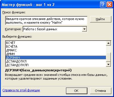 Нажмем стрелочку рядом с кнопкой Автосумма и из списка выберем пункт Другие функции. В открывшемся окне выберем категорию Работа с базой данных и функцию ДСРЗНАЧ: