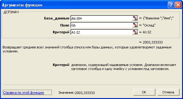 На следующем шаге Мастера функций для поля База_данных зададим диапазон A6:I84, в котором хранятся исходные данные, включающие заголовки столбцов.