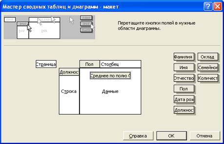 В открывшемся одноименном окне перетащим поле Пол в заголовки столбцов, поле Должность - в заголовки строк, а поле Оклад – в раздел Данные.