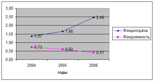 Как видно из рисунка 5, в 2005 году в организации произойдет рост фондоотдачи с 1,37 до 1,66, а в 2006 году до 2,46 руб. на рубль фондов. В 2005 году произошло падение фондоемкости с 0,73 до 0,6 , а в 2006 году до 0,41.