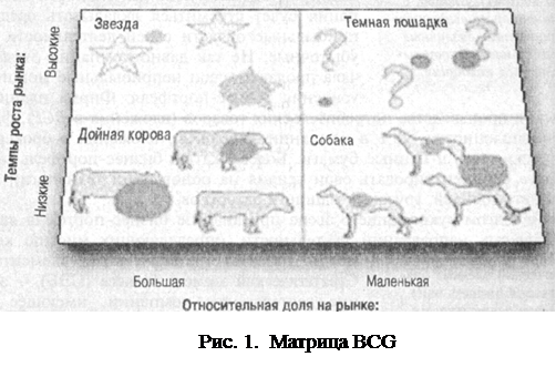 В ней для определения перспектив развития организации используется такой показатель, как рост объема спроса, а для оценки масштабов организации – ее доля на рынке. Матрица предлагает следующую классификацию товаров, заказов и, соответственно, типов бизнесов организации – "звезды", "дойные коровы", "темные лошадки" и "собаки", и предлагает соответствующие стратегии для каждого из них (рис. 1).[4]