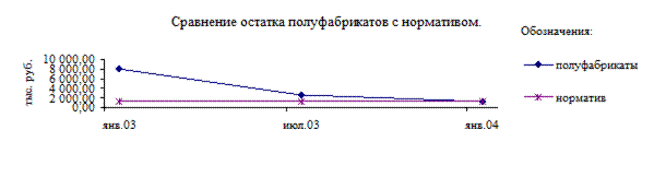 На основании динамики остатков МПЗ можно сделать вывод, что на предприятии ФГУП «СМУ № 806 при Спецстрое России» за период с 01.01.03 г. по 01.01.04 г. имеются сверхнормативные остатки по материалам, полуфабрикатам и готовой продукции. По незавершенному производству сверхнормативных остатков нет, но в целом суммарные средние остатки МПЗ выше нормативных на 15966,23 тыс. руб.