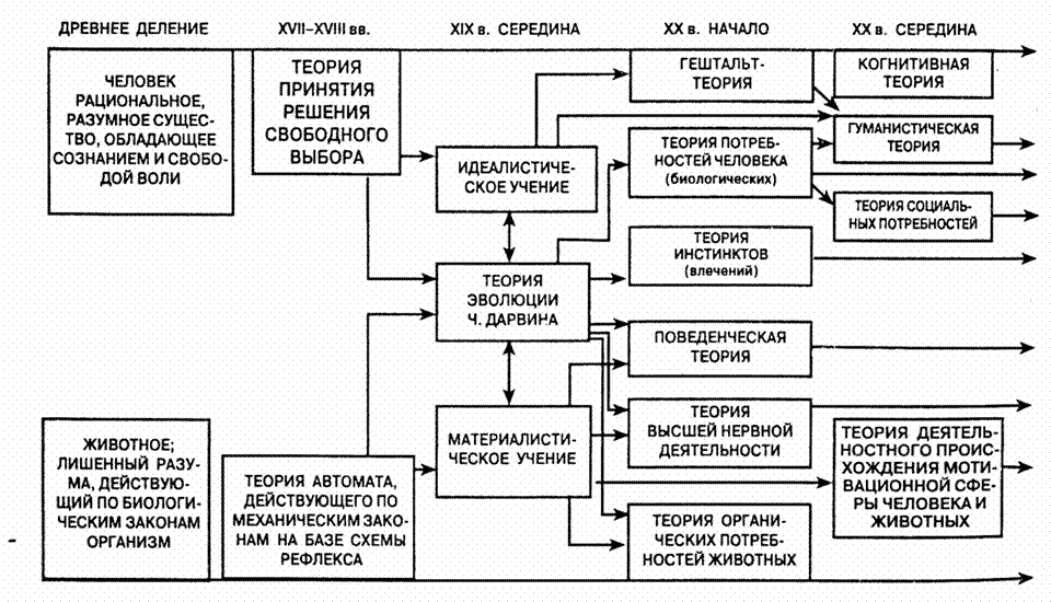 Иррационализм как учение в основном рассматривал поведение животных. Сторонники данного учения исходили из утверждения, что поведение животного в отличие от человека несвободно, неразумно, управляется темными, неосознаваемыми силами, имеющими свои истоки в органических потребностях. Схематично история исследования проблемы мотивации представлена на рис.1. Изображенная на нем схема была предложена американским ученым Д. Аткинсоном и частично модифицирована Р. С. Немовым.
