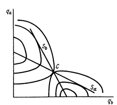Наложив на рис. 11 аналогичный рисунок для фирмы В, получим рис. 12, на котором равновесие Курно отмечено точкой С, а равновесие Штакельберга точкой Sa при лидерстве фирмы А и точкой Sb при лидерстве фирмы В.