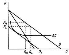 Кривая АС представляет средние затраты на выпуск всех участников картельного соглашения. Для предотвращения появления новых конкурентов вместо сочетания Рм,0м, соответствующего точке Курно, нужно выбрать комбинацию pl,ql. Тогда остаточный (неудовлетворенный) спрос на данном рынке будет представлен отрезком pl , Q1, который целиком расположен ниже кривой средних затрат. Поэтому если потенциальные конкуренты имеют одинаковую с членами картеля технологию, то производить данное благо им не выгодно.