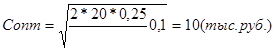 где С опт- оптимальный размер заказываемой партии, тыс. руб. К - стоимость доставки одной партии товара, тыс. руб. Q – месячный оборот склада, тыс. руб./ мес. М – стоимость хранения товара на сумму 1 тыс. рублей в течение месяца, тыс. руб./ мес. В нашем случае имеем следующие исходные данные (данные взяты из первичной документации, используемой на складе): - месячный оборот склада равен 20 тыс. руб./ мес. - стоимость хранения материала на суму в 1 тыс. руб. в течение месяца равен 0,1 тыс. руб./ мес. - стоимость одной партии материала равна 0,25 тыс. руб. При данных исходных данных, подставленных в формулу (8), получим: