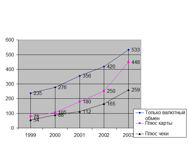 Курс обмена валют может быть фактически любым, отличаясь от официально установленного Центробанком в любую сторону на любую величину. Более того, настоящими считаются только те цифры, что вывешены возле окошка на информационном стенде. Динамика количества банков, предлагающих различные наборы сервисных услуг по валютно-обменным операциям представлена на ПЛАКАТЕ №2.