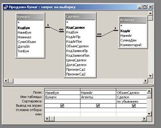 В Конструктор запроса перенесем поле НаимБум из таблицы Бумаги, поле НаимАг из таблицы Агенты и поле ОбъемСделки из таблицы Сделки.