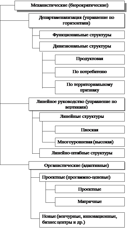 Большую часть организационных структур механистического (бюрократического) типа можно разделить на две категории: функциональные и дивизионные структуры. В последнее время наибольший интерес представляет комбинированная или матричная структура.