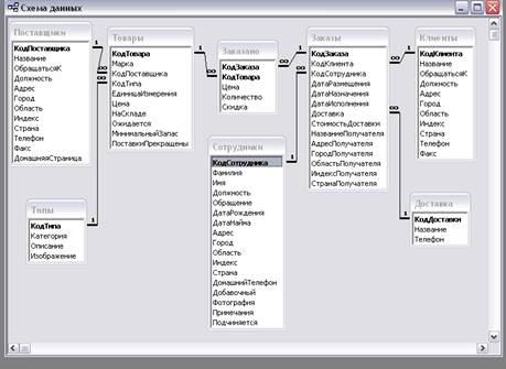Между 8 таблицами базы данных «Борей» установлены следующие связи типа «один-ко-многим»: