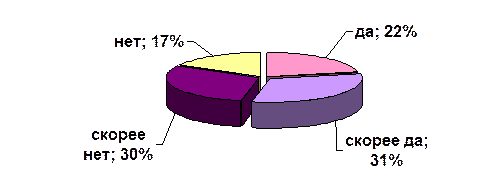 Ответы персонала о наличии команды распределились примерно поровну: на тех, кто считает свое окружение командой (22%) или скорее считает командой (31%) и на тех, кто отрицает командность в коллективе. Тех, кто категорически отрицает наличие командного духа - 17%, тех, кто колеблется в своем выборе и не в полной мере признает команду - 30%. Такой разброс ответов свидетельствует о разобщенности коллектива и необходимости повышения корпоративности.