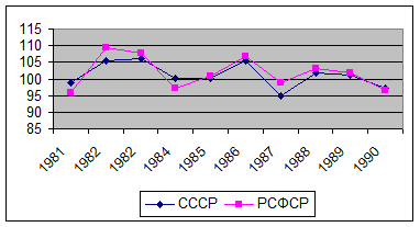 Темпы роста сельскохозяйственного производства в СССР и РСФСР, годовые индексы продукции сельского хозяйства, все категории хозяйств,%