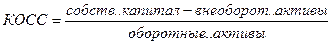 Так, например, анализируя методику расчета коэффициента текущей ликвидности (КТЛ) и коэффициента обеспеченности собственными средствами (КОСС), можно выявить их взаимосвязь. Коэффициент текущей ликвидности определяется как отношение стоимости находящихся в наличии у предприятия оборотных средств в виде производственных запасов, готовой продукции, денежных средств, дебиторской задолженности и прочих оборотных активов к срочным обязательствам в виде краткосрочных кредитов банков и займов и кредиторской задолженности. Коэффициент обеспеченности собственными средствами определяется как отношение разности между объемами источников собственных средств и фактической стоимостью основных средств и прочих внеоборотных активов к сумме находящихся в наличии у предприятия оборотных средств. Отсюда вытекает выражение, определяющее взаимосвязи этих показателей: