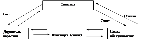 Держатель карточки получает от магазина покупку в кредит, поскольку не передает в кассу непосредственно наличные деньги в момент получения товара. Магазин, представив слип, получает от своего банка денежное возмещение покупки. Банк магазина непосредственно или через расчетный банк платежной системы получает эту же сумму от банка-эмитента данной карточки. Банк-эмитент получает деньги с клиента путем их списания с его счета. Если клиент и торговое предприятие имеют счета в одном банке, то этот банк вообще может обходиться без услуг процессинговой компании, при условии что сам проводит авторизацию.