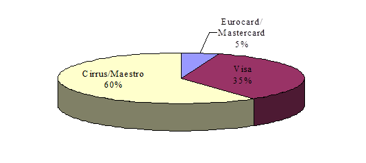 Важно отметить, что существенных изменений структура международных карт, выданных в отделении в четвертом кварталах 2002 года и 2003 года, не претерпела. Так, доля карт “Eurocard/MasterCard” осталась неизменной и составляла 2,5% от общего числа выданных карт. Карта “Visa” увеличила свою долю с 26,9% в четвертом квартале 2002 года до 31,6% в том же периоде 2003 года.