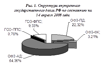 Рассмотрим современное состояние внутреннего долга по состоянию на 14 апреля 2008 года.[3] Объем государственного внутреннего долга, выраженного в государственных ценных бумагах, на 14 апреля 2008 года составил 1 329 574,838 млн. рублей. Наибольший вес (более 60% от общей суммы долга) занимают облигации федерального займа с амортизацией долга, наименьший (менее 1%) – государственные сберегательные облигации с постоянной процентной ставкой.