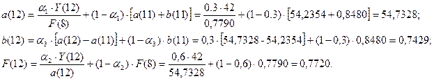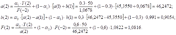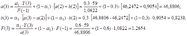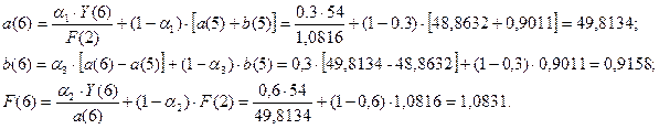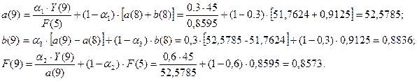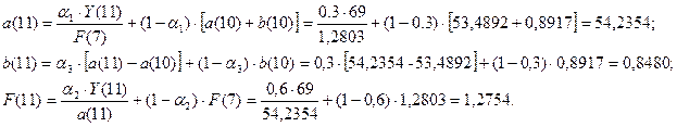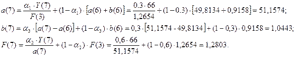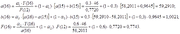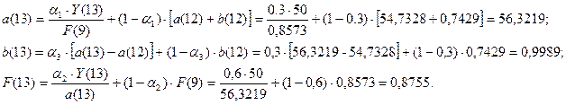 1) Построить адаптивную мультипликативную модель Хольта-Уинтерса с учетом сезонного фактора, приняв параметры сглаживания α1=0,3; α2=0,6; α3=0,3.