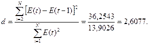 - независимости уровней ряда остатков по d-критерию (критические значения d1=1,10 и d2=1,37) и по первому коэффициенту автокорреляции при критическом значении r1=0,32;