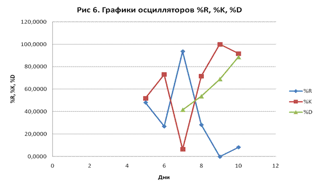 Индексы стохастических линий %Rt, %Kt, %Dt рассчитаем по формулам:
