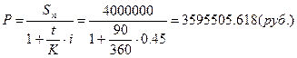 3.2. Через Тн дней после подписания договора должник уплатит S руб. Кредит выдан под i% годовых (проценты обыкновенные). Какова первоначальная сумма и дисконт?
