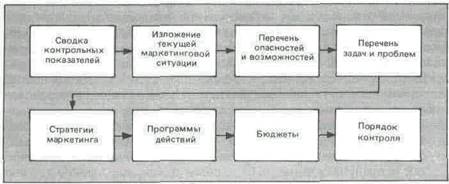 Как выглядит обычный план маркетинга? В этом разделе речь пойдет главным образом о планах выпуска обычных или марочных товаров. План выпуска обычного или марочного изделия должен включать в себя следующие разделы: сводка контрольных показателей, изложение текущей маркетинговой ситуации, перечень опасностей и возможностей, перечень задач и проблем, стратегии маркетинга, программы действий, бюджеты и порядок контроля за исполнением намеченного (см. рис. 1.).