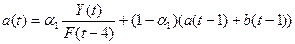 1) Построить адаптивную мультипликативную модель Хольта-Уинтерса с учетом сезонного фактора, приняв параметры сглаживания a1=0.3, a2=0.6, a3=0.3.