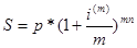 где S – сумма к получению, p – вложенная сумма, i(m) – процентная ставка выплачиваемая m раз в год, n – срок вклада в годах.