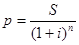 Воспользуемся формулой S = p(1 + i)n для расчета по сложной процентной ставке, и преобразовав её получим формулу: