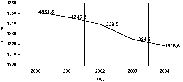 Рынок труда является такой же реальностью, как и все реально существующие в нашем регионе рынки. Они характеризуются деформированными структурами, глубокими расхождениями спроса и предложения: одновременно здесь уживаются неудовлетворенный спрос и избыточное предложение. Одним из основных факторов, оказывающих влияние на рынок труда в регионе, является демографическая ситуация, а так же состояние трудовых ресурсов области, наличие на территории экономически активного, трудоспособного населения. Численность населения юга Тюменской области на конец 2004 года составила 1318,5 тыс. человек, это свидетельствует о снижении числа жителей региона. Цифры подтверждают, что с 2000 года по 2003 год численность населения уменьшилась на 26,7 тыс. человек или на 2,5%. (Рис.1).
