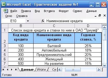 2. На рабочем листе Данные создаем таблицу «Список видов кредита и ставки по ним в ОАО «Триумф»