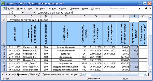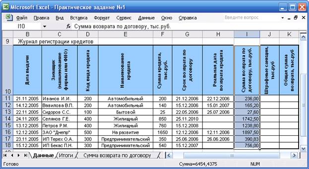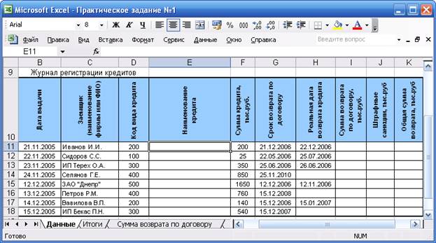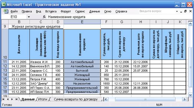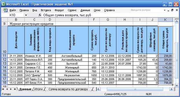 2. Организовать межтабличные связи для автоматического заполнения граф журнала регистрации кредитов (рис. 12.2): «Наименование кредита», «Сумма возврата по договору, тыс. руб.», «Штрафные санкции, тыс. руб.», «Общая сумма возврата, тыс. руб.».
