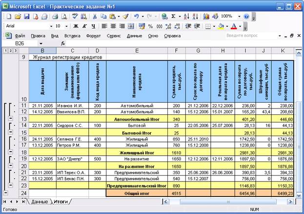 9. В таблице «Журнал регистрации кредитов» вставляем автоматические промежуточные (для каждого кредита) и общие итоги в списке по полям Сумма кредита, тыс. руб., Сумма возврата по договору, тыс. руб., Общая сумма возврата, тыс. руб. (Рис. 7)