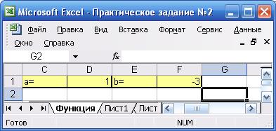 В отдельных ячейках D1 и F1 задаем значения параметров a и b, равные 1 и -3 соответственно. (Рис.10)