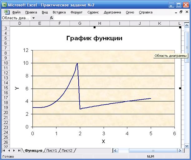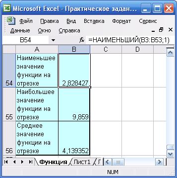 Построить таблицу значений функции f на заданном интервале с шагом 0,1 используя функцию ЕСЛИ. Значения параметров a и b задать в отдельных ячейках. С помощью встроенных функций вычислить минимальное, максимальное и среднее значение функции на отрезке. Построить точечный график функции, содержащий подписи осей x и y и название графика.